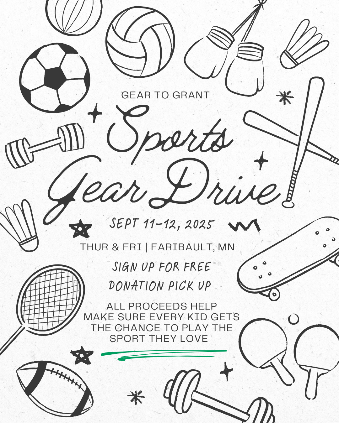 Clear out your clutter and help kids play sports. We are hosting a Sports Gear Drive this week, on Thursday and Friday, in the greater Faribault, MN area. Please consider donating your gently used or new sports gear, including sports apparel, equipment, sports tools - you name it. We’re compiling a list of sports gear ideas you may have sitting around unused that you could donate. All proceeds go to helping kids play a sport they love.